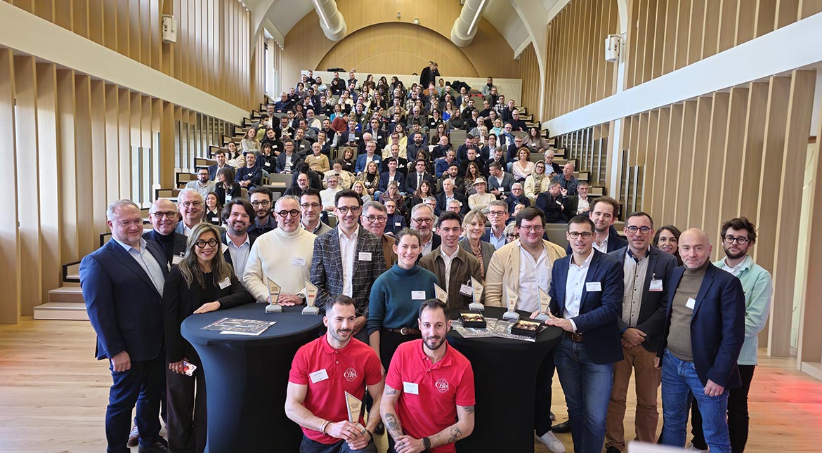 Légende : Grande photo, l’ensemble des lauréats et partenaires de l’édition 2025 des Trophées de l’économie pris en photo dans le nouvel amphithéâtre du Crédit Mutuel Anjou. Photo 2 : Yves Gidoin remet le Trophée « Coup d’éclat de l’année » à Amaury Barberot, pdg d’Expliseat.