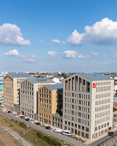 Cette opération immobilière a été menée à bien par le groupe Giboire et dessinée par l’architecte angevin Frédéric Rolland. Le résultat est impressionnant : 11 000 m² de surface au sein de quatre immeubles de 5 à 8 étages en forme de nef industrielle et reliés entre eux par différentes passerelles.
