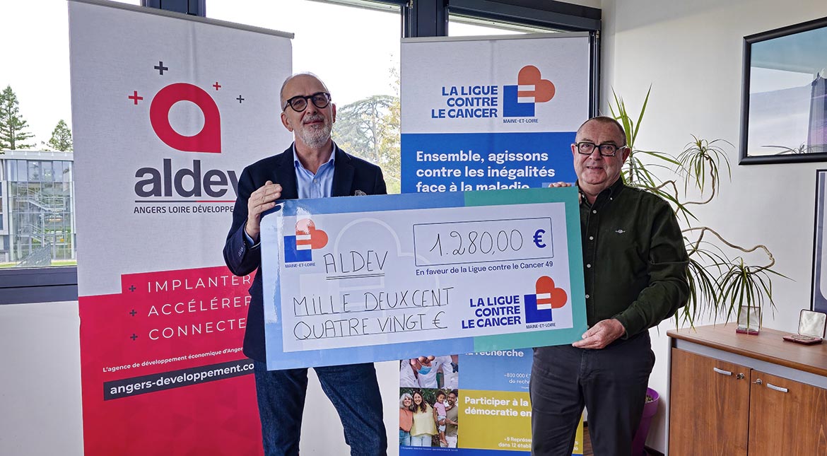 Légende : Remise du chèque par Jean-Baptiste Mantienne, le directeur général d’Aldev, à Hervé Fillon, le président départemental de la Ligue contre le cancer, le 6 novembre 2025 dans les locaux angevins de la Ligue, rue Roger-Amsler.