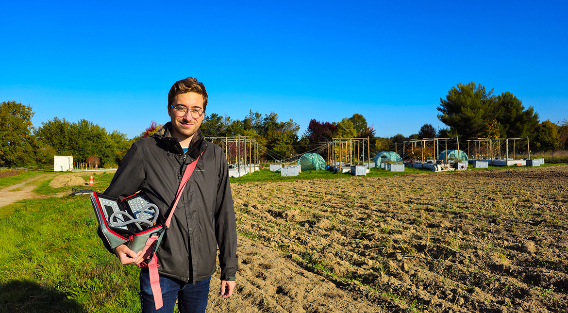 Légendes photos. Grande photo : Pierre Parpay tenant son poromètre, un appareil qui mesure combien une feuille « respire » en observant l’ouverture de ses pores. À l’arrière-plan, l’expérimentation à échelle réduite menée sur le campus de Belle-Beille, avec les quatre espèces sélectionnées. Première petite photo : Pierre Parpay utilise son poromètre pour mesurer la respiration d’une feuille de charme. Seconde petite photo : Dispositif de mesure installé sur une rangée de charmes.